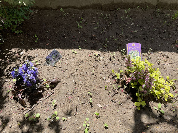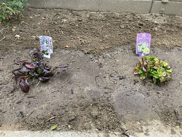 2025/11/6 夏の間に左上の株がネキリムシに食べられ枯れてしまいました。代わりに鉢で増やしたバーガンディーグローを植えることに。