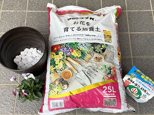 鉢底石を敷いて、培養土を入れて、害虫予防にオルトランDXを少々混ぜて……。