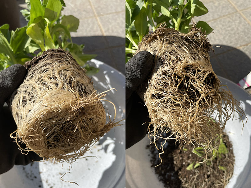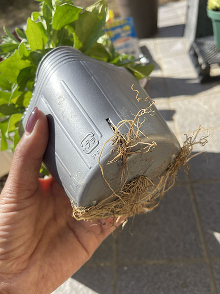 スチールブルーの根っこはすでにポリポットからはみ出ています。